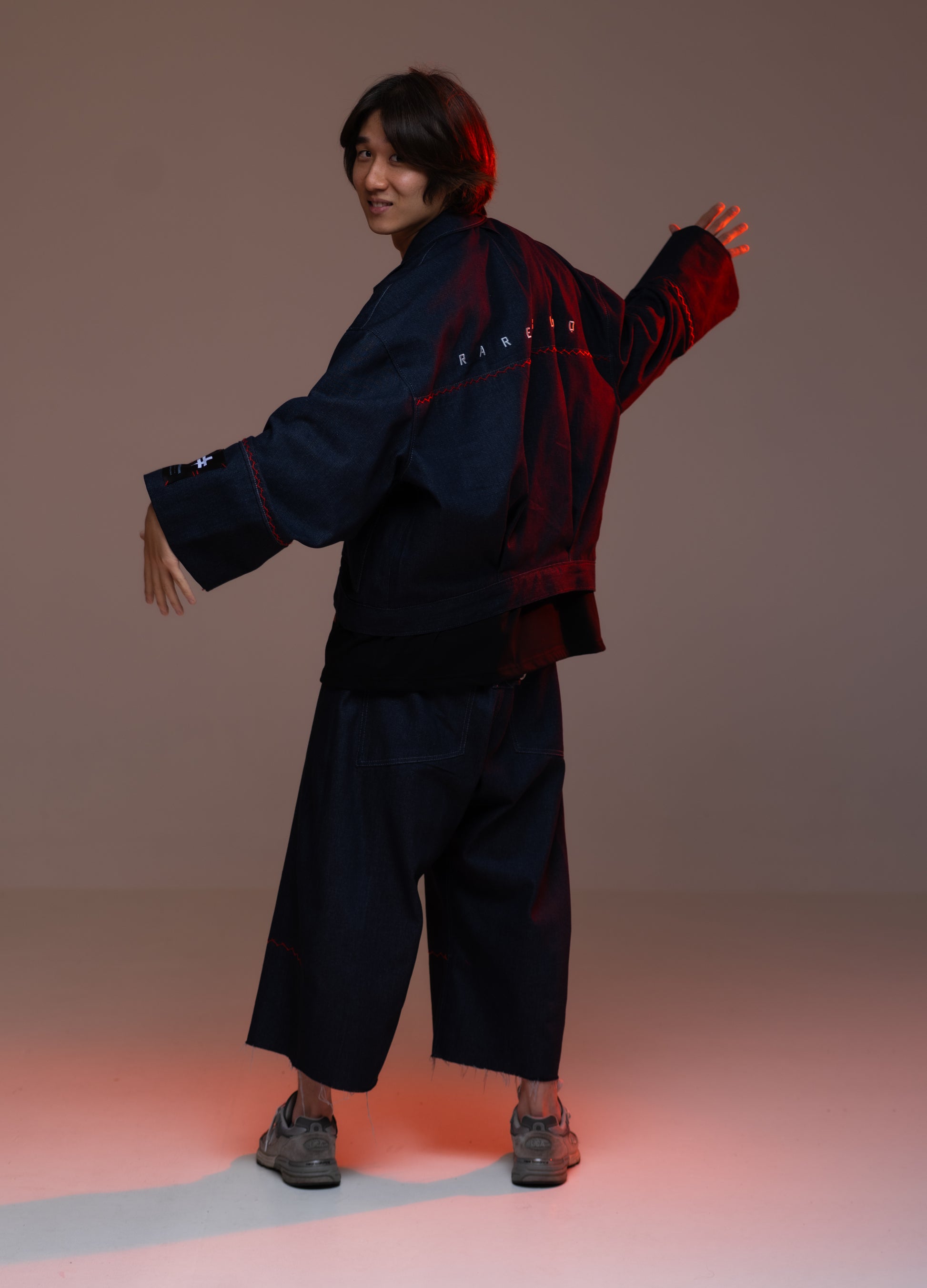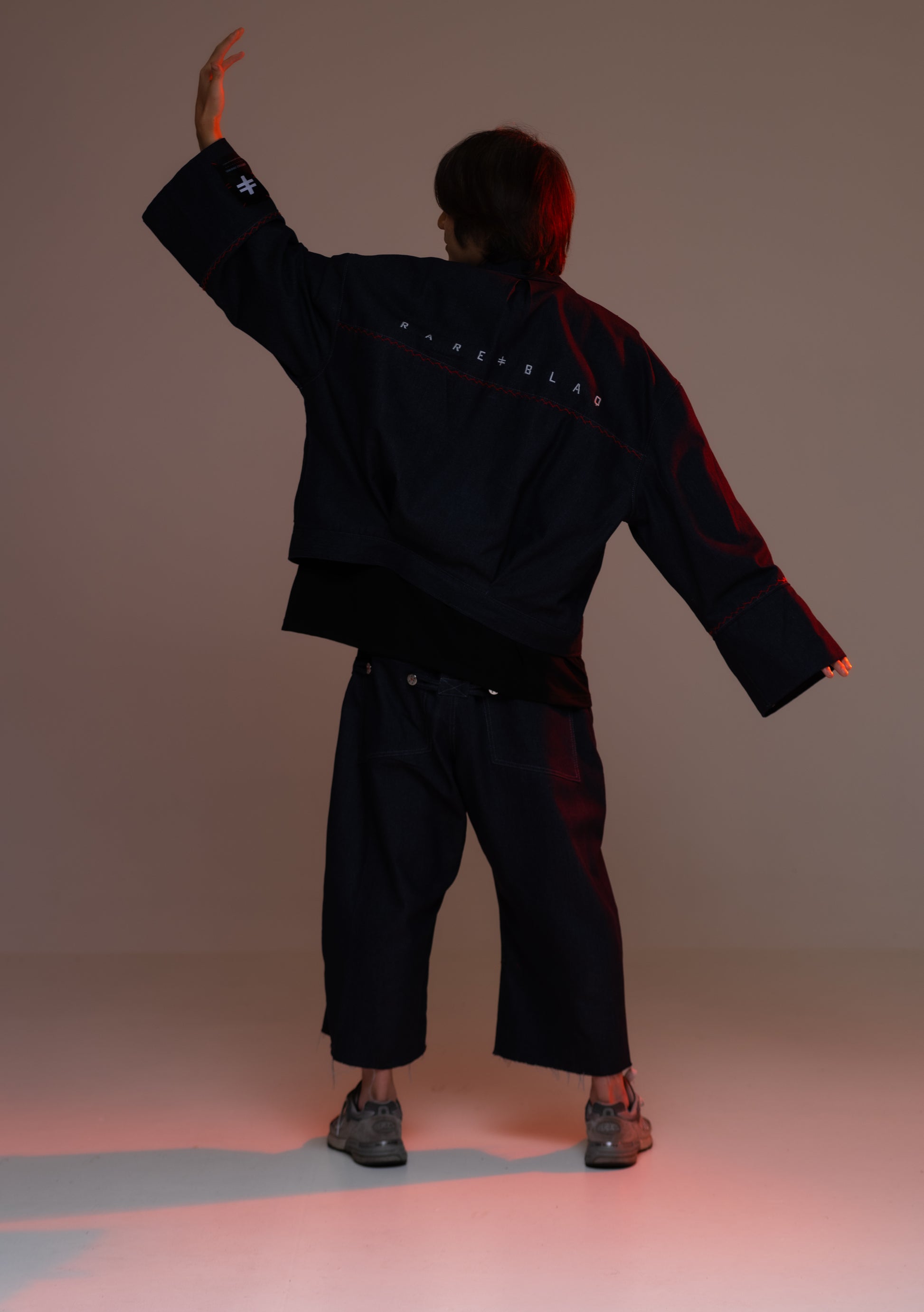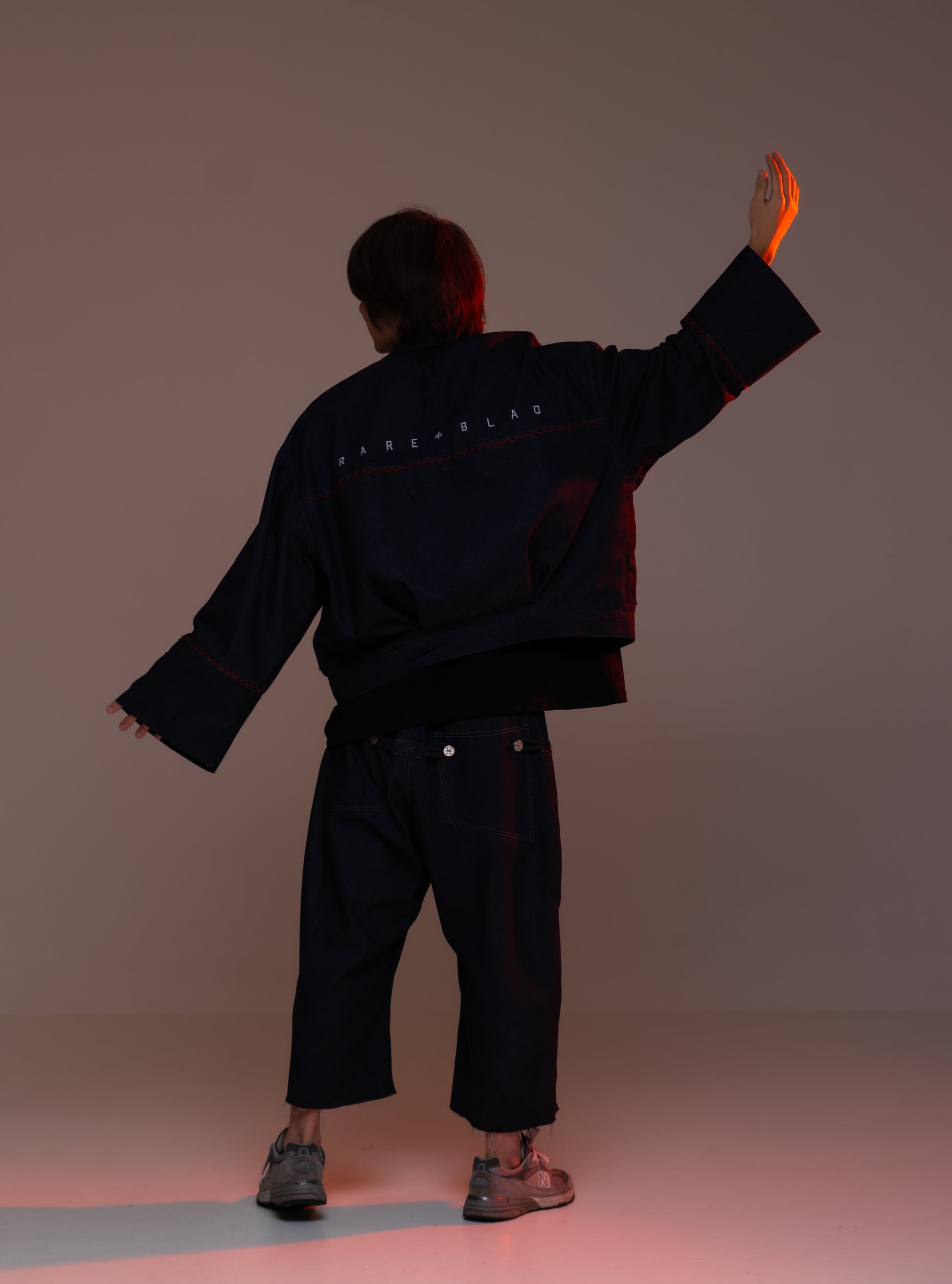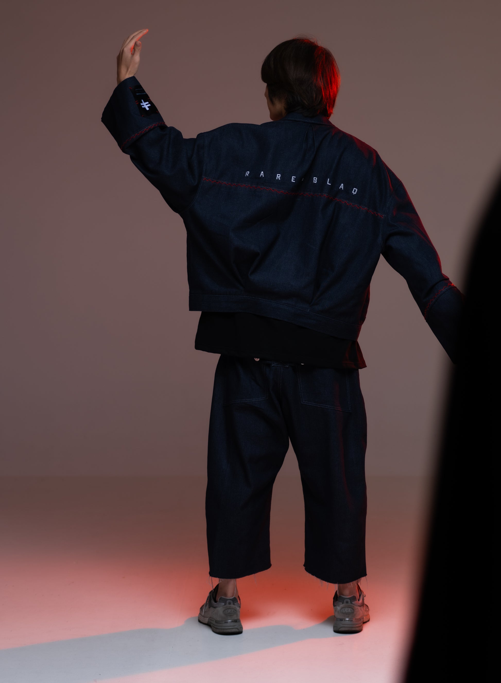 Cut from pure cotton denim, the silhouette carries RareBlaQ’s architectural balance — wide proportions, raw hems, and visible seams in contrast stitch. The jacket’s loose belt and cropped finish echo construction layers, while the pants fall in structured rhythm — unfinished yet intentional.