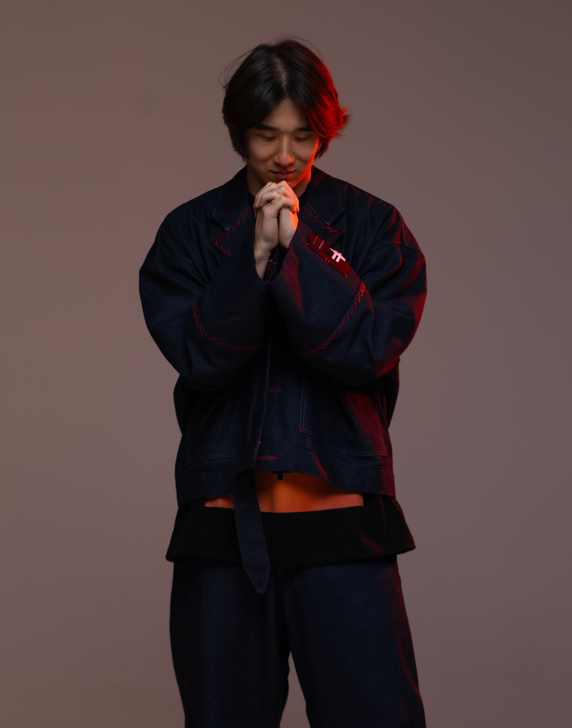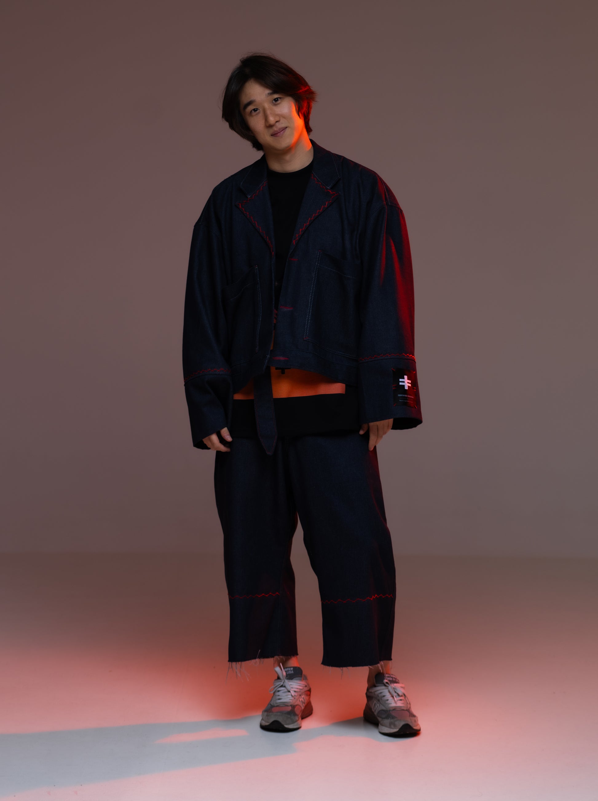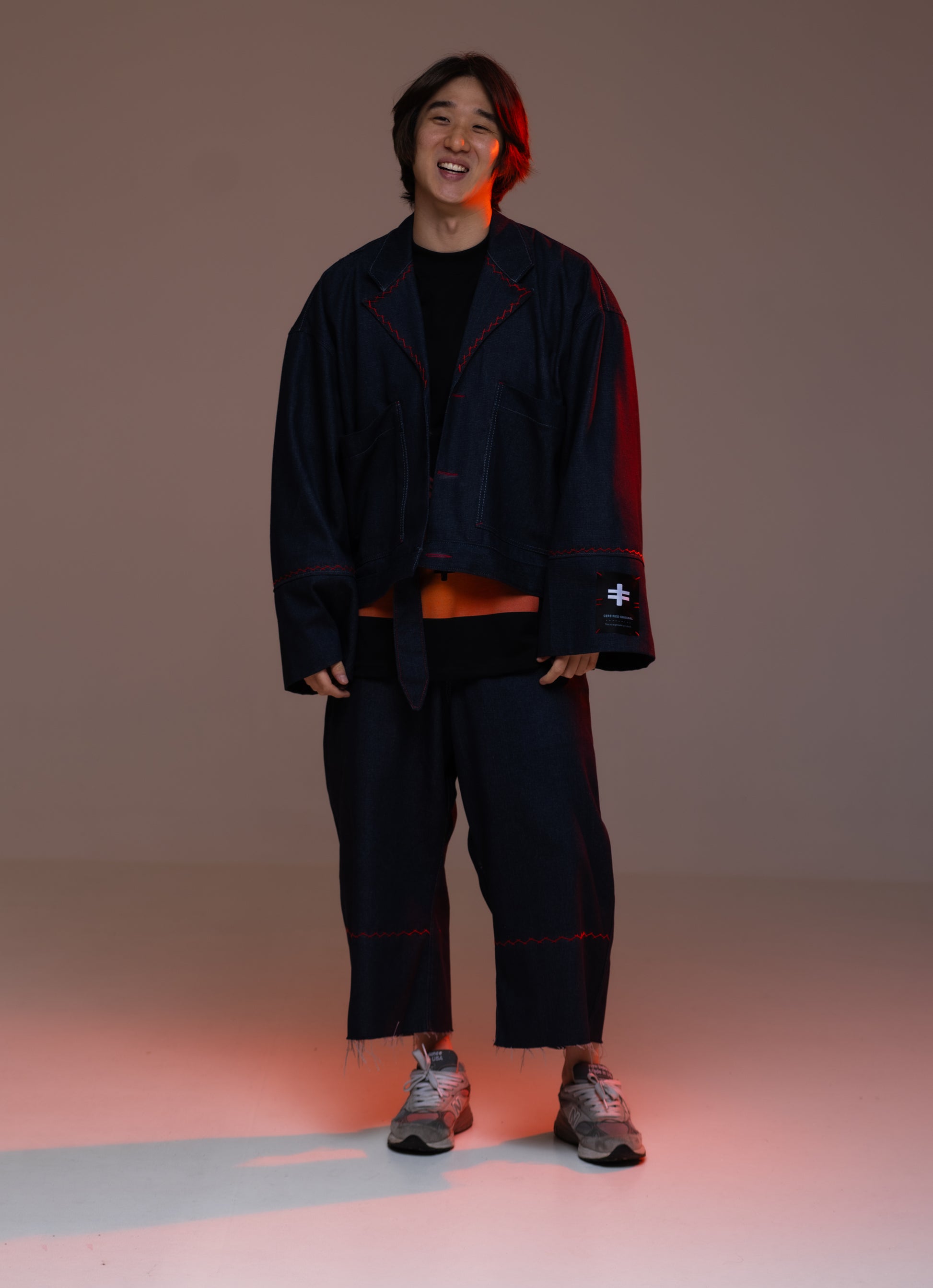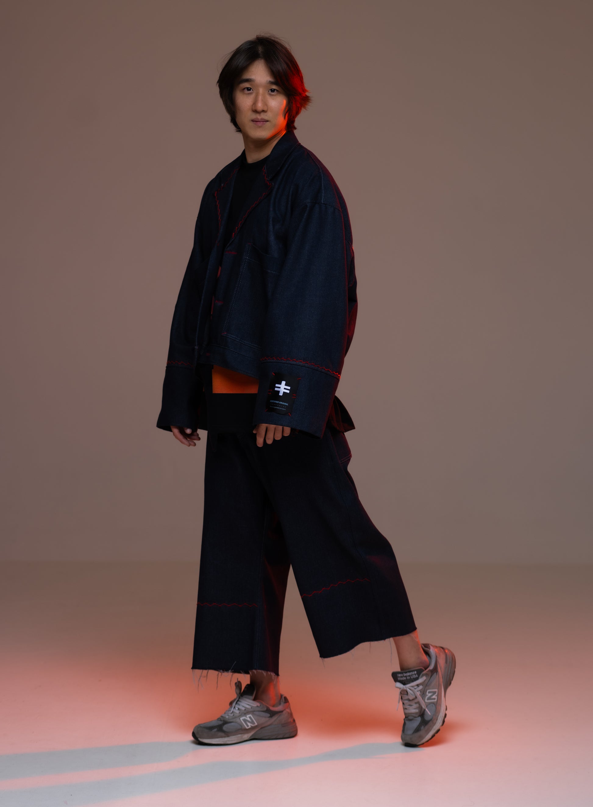 Cut from pure cotton denim, the silhouette carries RareBlaQ’s architectural balance — wide proportions, raw hems, and visible seams in contrast stitch. The jacket’s loose belt and cropped finish echo construction layers, while the pants fall in structured rhythm — unfinished yet intentional.